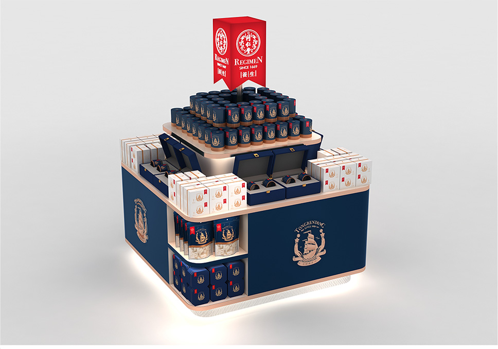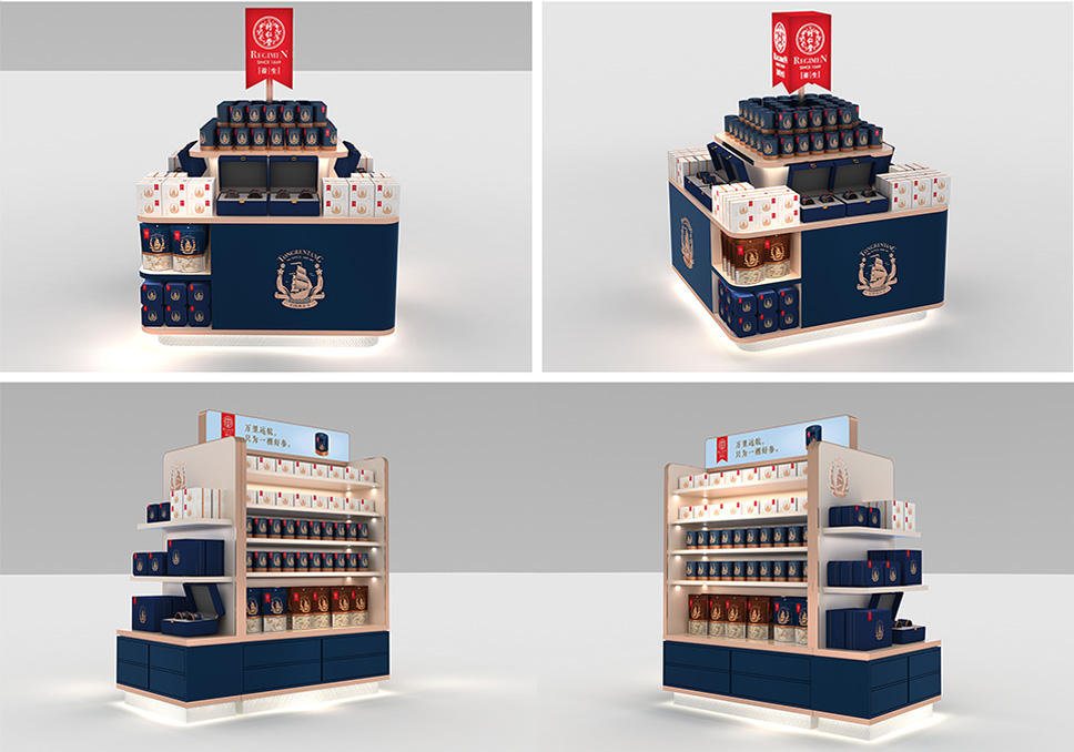 李華清以突出的文化視覺語言表現(xiàn)為同仁堂養(yǎng)生專柜終端賦能。以產(chǎn)品文化基因,”皇后號帆船“外部形態(tài)為設計靈感,沿用品牌標識的色彩定位,體現(xiàn)皇后號滿載道地優(yōu)質(zhì)西洋參萬里遠航而來的視覺形象。配合燈光系統(tǒng)、配色方案、材料運用、產(chǎn)品產(chǎn)列等方面內(nèi)容,使西洋參市場終端營銷型展臺能在線下銷售端達到終端聚焦戰(zhàn)略效果,塑造出強大的形象識別力,建立起品類的絕對區(qū)隔與識別。