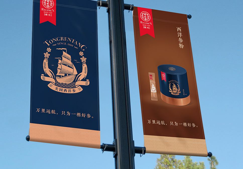 標識最終以船標的視覺形式呈現(xiàn),建立同仁堂西洋參品類區(qū)隔。標識構(gòu)建皇后號帆船遠赴海外滿載優(yōu)質(zhì)道地的西洋參行來的故事場景,塑造同仁堂西洋參產(chǎn)品,道地優(yōu)質(zhì)的戰(zhàn)略文化背書。